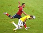 Neymar sofre uma joelhada, maldosa, de Zúniga, nas costas um pouco antes do final do segundo tempo e está fora da copa. Brasil vence por 2x1.